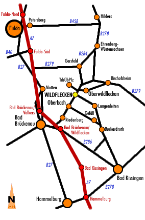 Die Marktgemeinde Wildflecken liegt nur ca. 15 Autominuten von der BAB 7, Abfahrt Bad Brückenau/ Wildflecken entfernt. Über diese Autobahn ist Wildflecken einfach von Süden oder Norden aus zu erreichen.